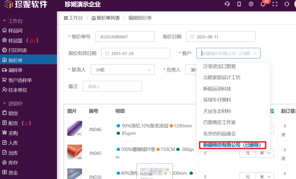 当样品与销货单、报价单、出库单等进销存单据产生关联时,无法删除样品。必须先删除相关单据才能顺利删除样品。