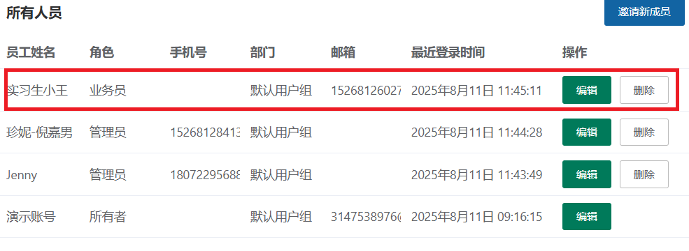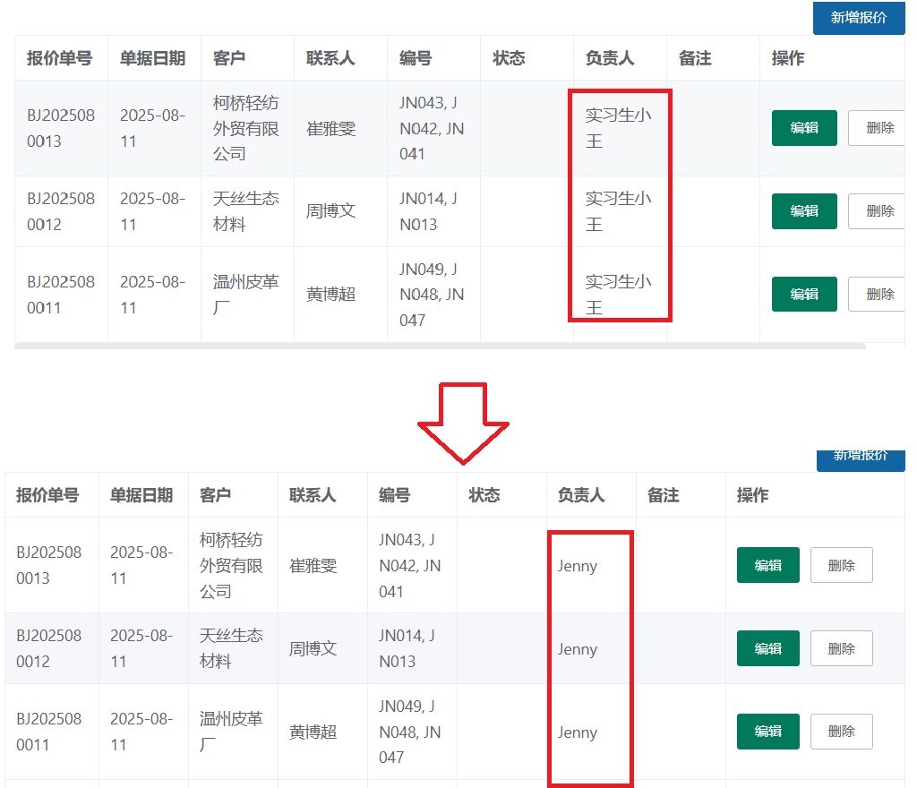 当业务人员离职并删除账户时,系统会弹出业务交接选择框,让管理员选择将该员工之前的所有业务交接给谁负责。