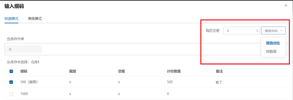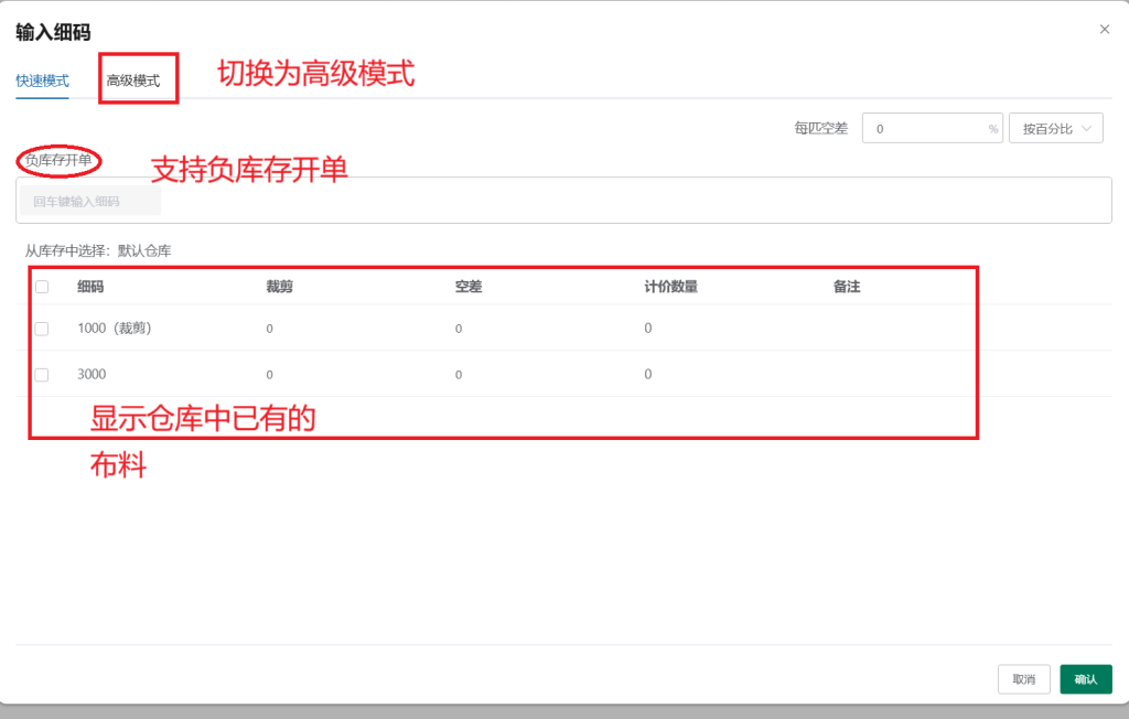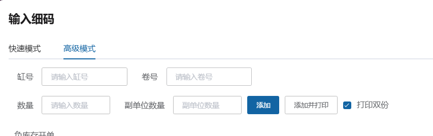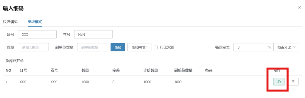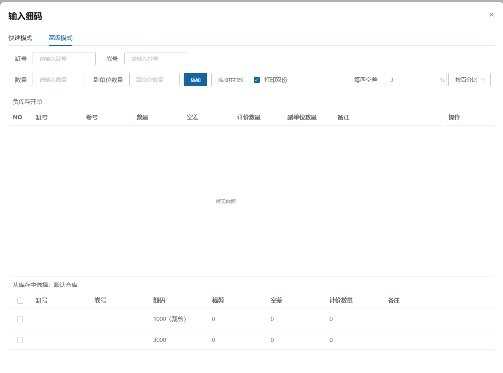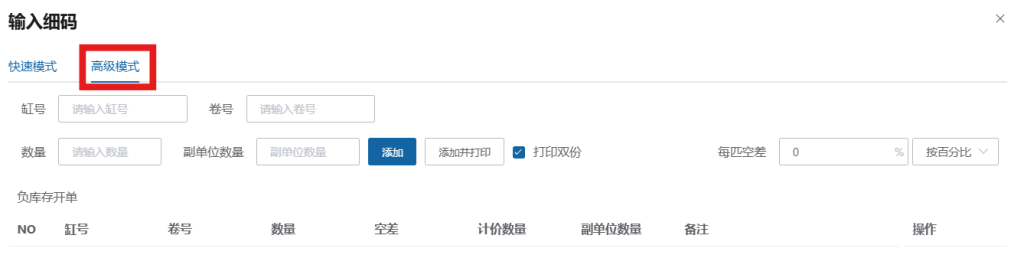 - 高级模式:输入缸号、卷号、空差等详细信息,设置默认仓库和计价数量