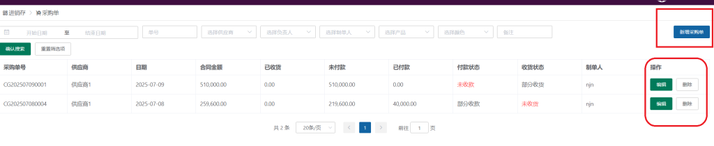 - 列表管理:采购单列表默认显示20条/页,展示供应商、金额、下单日期等信息