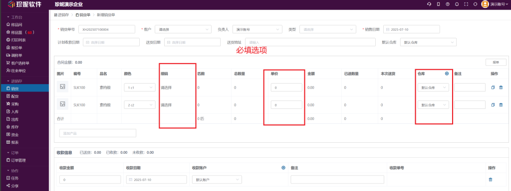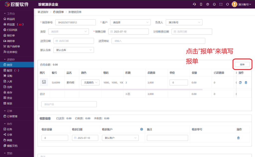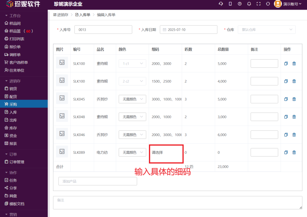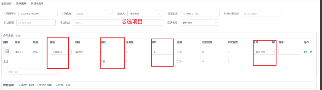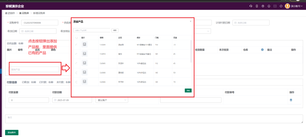 添加产品:选择布料产品后,系统会自动显示在产品列表中。填写相关产品信息,包括品名、颜色、数量和单价。