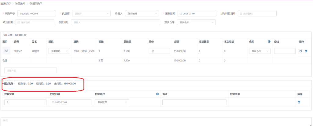 - 自动计算:系统自动计算已收货、已付款和未付款金额