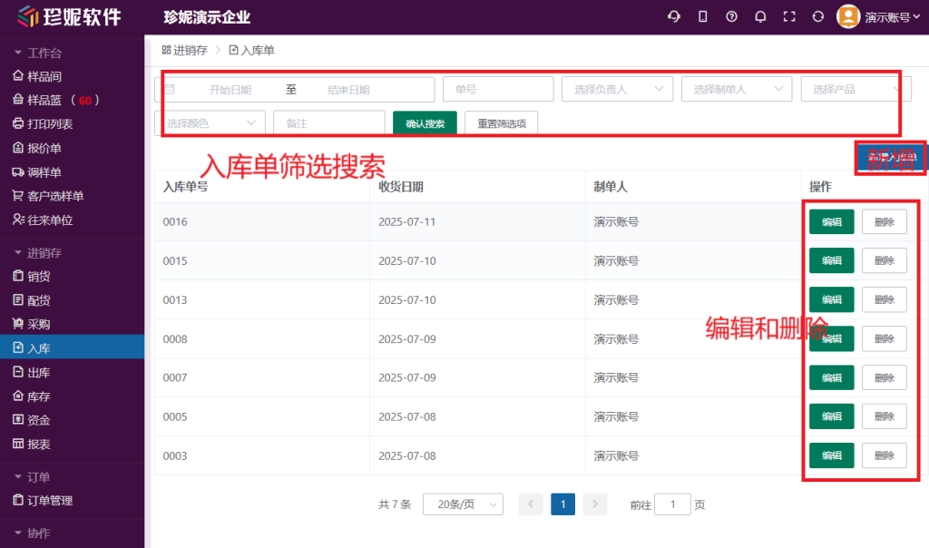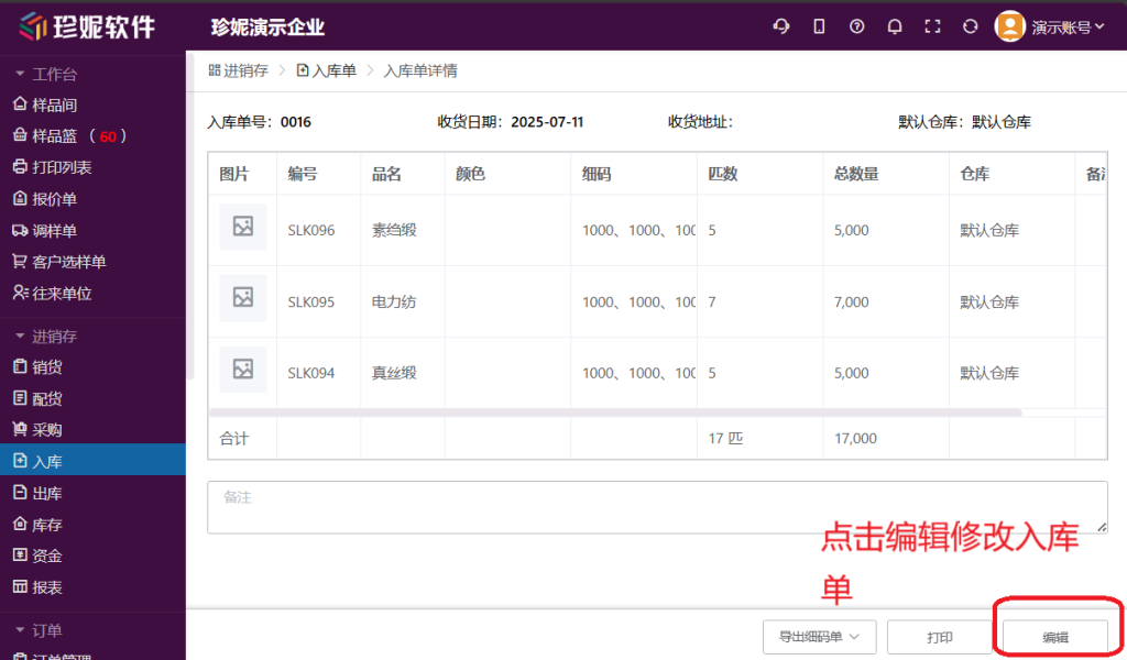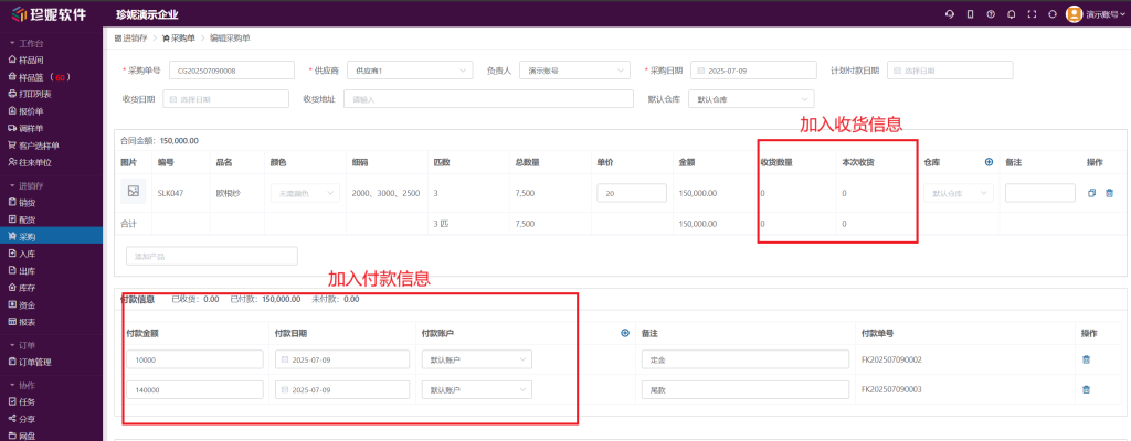功能作用:记录供应商采购的布料入库流程,自动同步库存和资金数据。