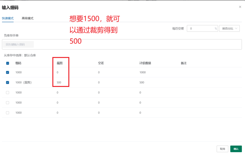 当需要的细码长度不是整匹时使用裁剪功能。输入所需长度,系统自动计算剩余长度并更新库存。