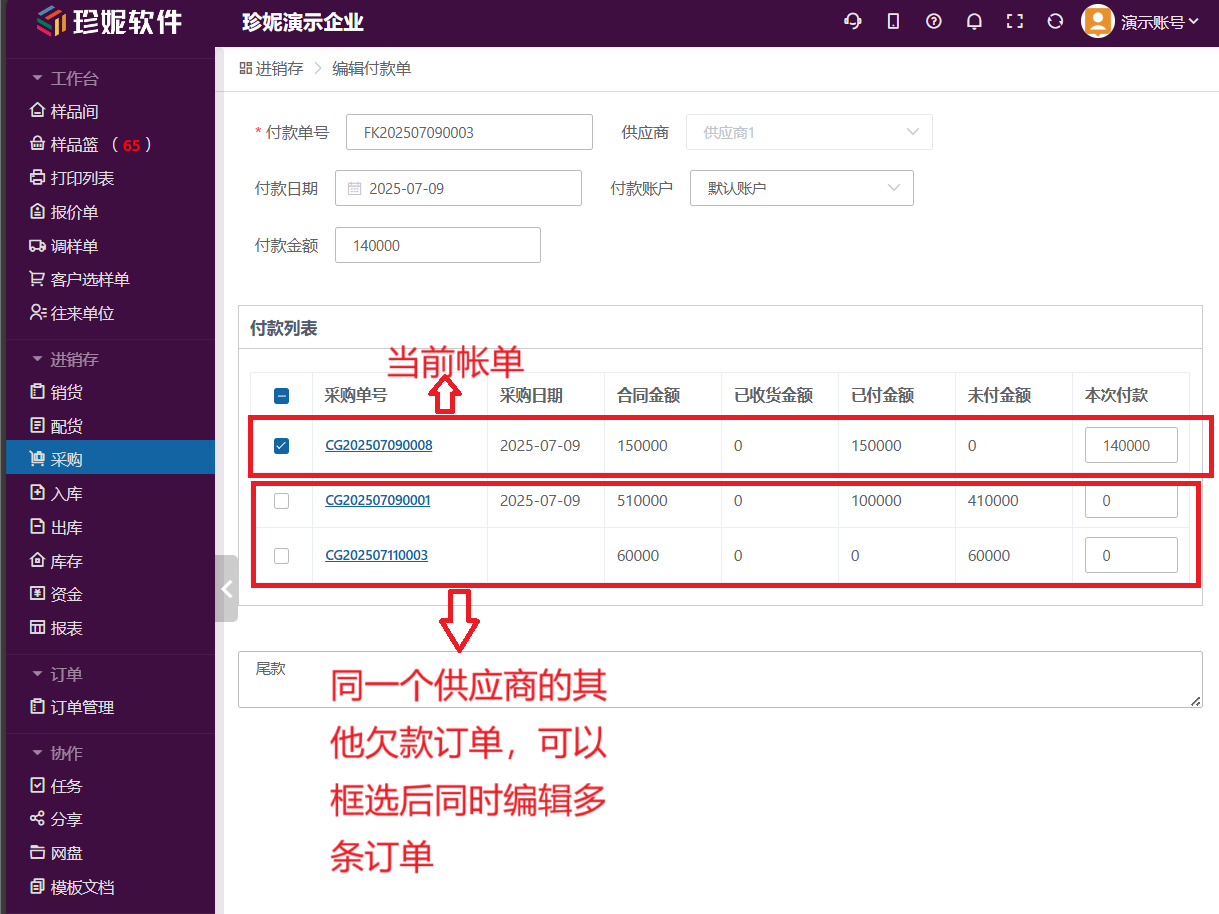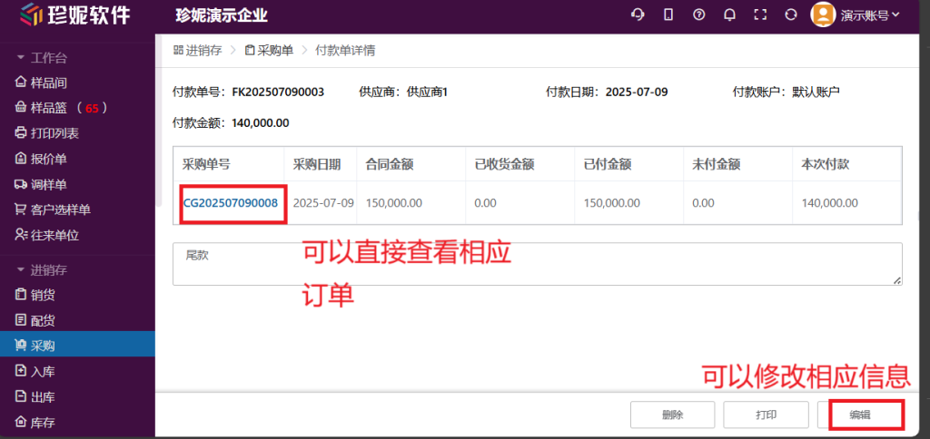 后期等货到付款后可在采购单详情里点击编辑按钮付款操作,支持多次付款记录: